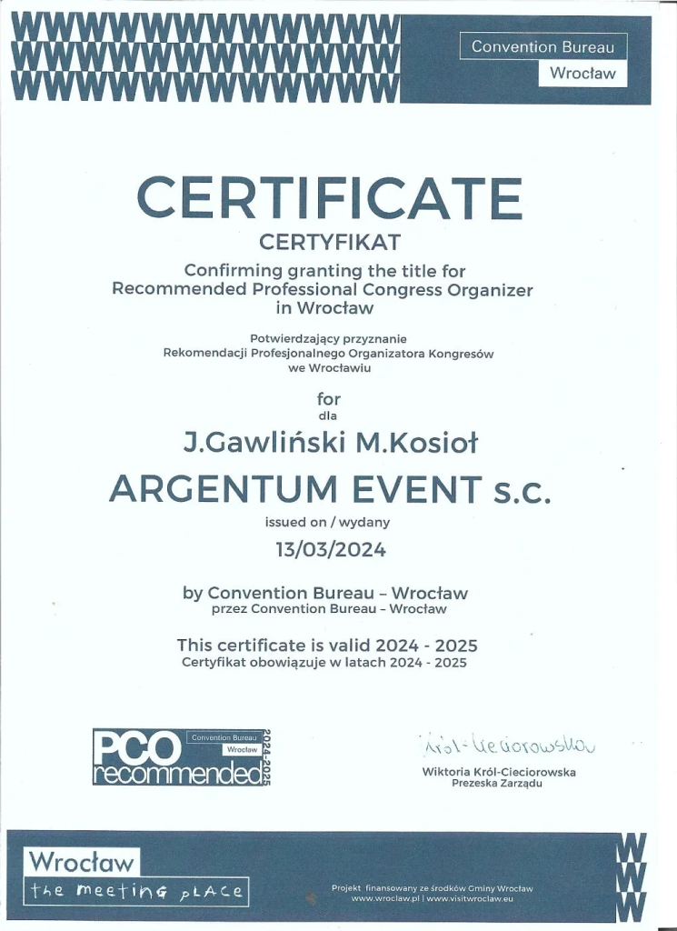 Our Professional Congress Organizer (PCO) Certificate, along with recommendations from Convention Bureau Wrocław 2024–2025, validates our expertise in managing corporate conferences and congresses. This certification ensures comprehensive planning and flawless execution.